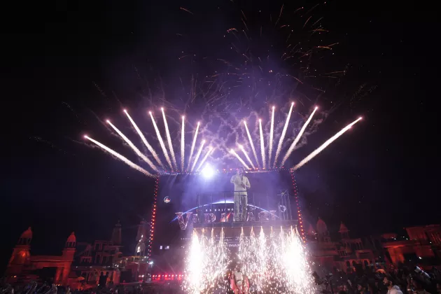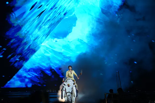 イベントのクライマックスでは、世界初披露となるプロモーションムービーの上映後、ステージ中央から続く花道に主演のマヘーシュ・バーブが“牛”に乗って登場するサプライズ演出も。続いて、夜空を埋め尽くすような花火が打ち上げられ、本作の製作発表を祝福した。マヘーシュ・バーブは「まるで夢のような映画です。一生に一度関われるかどうかの企画だと思う。だからこそ必要な努力は惜しまない。皆の期待に応えたいし、何より監督の期待に応えたい。『Varanasi』の公開はインド全土の誇りになるはずだ。今日のイベントでタイトルが発表され、映像が公開された。この先に続く世界は、皆さんの想像を間違いなく超えていきます」と語り、5万人の観衆から大きな歓声を浴びた。