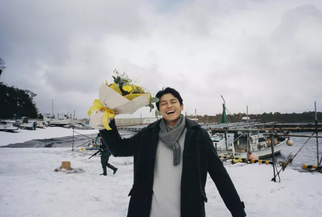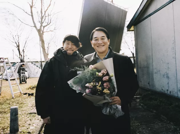 公開されたオフショットでは、仲睦まじい様子でカメラに笑顔を向ける舘と尾上の“ほのぼのショット”をはじめ、互いをリスペクトし合う舘&眞栄田の笑みが溢れる2ショット、さらに撮影の合間に監督の隣でブランコを漕ぐ微笑ましい尾上など、リラックスしたキャスト陣の姿が印象的だ。そんな本作の撮影は、2023年11月〜12月に渡り、石川県・富山県を舞台に撮影を敢行。ロケ地となった富山の美しい雪景色をバックに、無事に撮影終了を迎え弾ける笑顔の眞栄田&黒島結菜(幸太の恋人・あや役)、安堵した表情で笑顔を見せるピエール瀧(河村組・大塚役)と藤井監督の2ショットなど、クランクアップ時の貴重なオフショットも。さらには川に飛び込むシーンの撮影で、その凍えるような寒さに思わずタオルに包まる一ノ瀬ワタル(幸太の先輩刑事・大黒役)の姿も収められた。