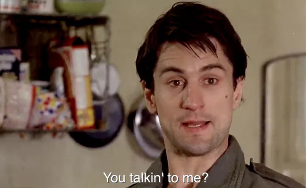 主人公のトラヴィスはタクシーを一日中、運転するなかでついに孤独に耐えかねて、議員の暗殺を企てます。ご紹介するアドリブは議員暗殺のため、家で銃を素早く取り出す練習をしているシーンで登場します。脚本には練習中に「鏡を覗き込む」としか書かれていなかったのですが、デニーロは鏡に映る自らに向かって「You talkin’ to me?(俺に話しかけているのか)」というアドリブを加え、主人公の狂った雰囲気を表現しました。
