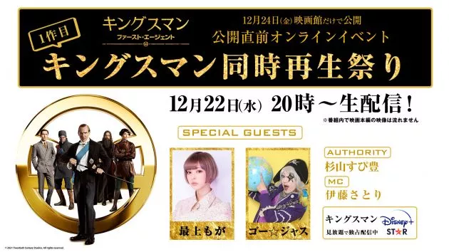 本イベントではゲストとして、「キングスマン」の大ファンだという、最上もが、ゴー☆ジャス、そして本シリーズに詳しいアメキャラ系映画ライター杉山すぴ豊が出演。これまでの「キングスマン」シリーズについての解説や、『キングスマン:ファースト・エージェント』の見どころ、注目ポイントなどについてトークする。