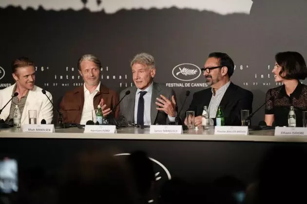 その後の記者会見では、全世界で人気を誇るシリーズの集大成とあって、会場は各国のメディアの記者で超満員になるなど、熱気が溢れんばかり。ハリソン・フォードは、先日【名誉パルム・ドール】を受賞したことについて「言葉では言い表せない気持ちでした。今も言葉にならないんだ。カンヌという場所で温かく歓迎され、とてもいい気分でした」と、その喜びを表現。さらに、「良い映画を観たかったんだ。最後を飾るにふさわしい物語をね。これまで若さに頼って生きてきたこの男の、変わらなければならない姿を。人間関係にしても、もっと深いものと、人生の重みを見たかった。これ以上の脚本は望めないよ。これ以上の出演陣も。監督やジョン・ウィリアムズが吹き込んだ情熱や手腕もそう。本当に幸運なことだった。」と、本作を共に作り上げたキャストやスタッフ陣への感謝を述べた。さらに本作でインディ・ジョーンズを引退する時だと思ったことについて、「私を見ればわかるだろう?(笑)少し立ち止まって休む必要があるからね。」とユーモアを交えて会場を沸かせながら、「私はこの仕事も、このキャラクターも、彼が私の人生にあたえてくれたことも、そのすべてが大好きなんだ。それがすべてだね。」とインディ・ジョーンズが彼の人生とって大きなものであったことを明かしてくれた。そして、スピルバーグから本作を引き継いだジェームズ・マンゴールドは、本作の監督をひきうけた理由について、「ハリソンは伝説的なスターである前に、ひとりの役者であり、常に自分が演じるべきものを探しているんだ。彼と最初に話した時、脚本に求めてきたものは、この映画の存在意義だったんだ。彼のように疑問や要求をしっかりと持った人と仕事ができるのは、脚本家としてまたとない機会さ。簡単に答えを出さず、疑問を持てと言ってくれる人なんだ。私がこの映画に参加した大きな理由はそこだよ。ハリソン・フォードから芸術の誘いを受けたと感じたからなんだ。」と、その大きな選択をしたきっかけについて振り返った。