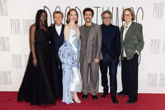 (L to R) Suzy Bemba, Willem Dafoe, Emma Stone, Ramy Youssef, Mark Ruffalo and Vicki Pepperdine attend the UK Gala Screening of Searchlight Pictures, ‘Poor Things’ at the Barbican London, on December 14, 2023. (Photo by StillMoving.Net for Disney)
