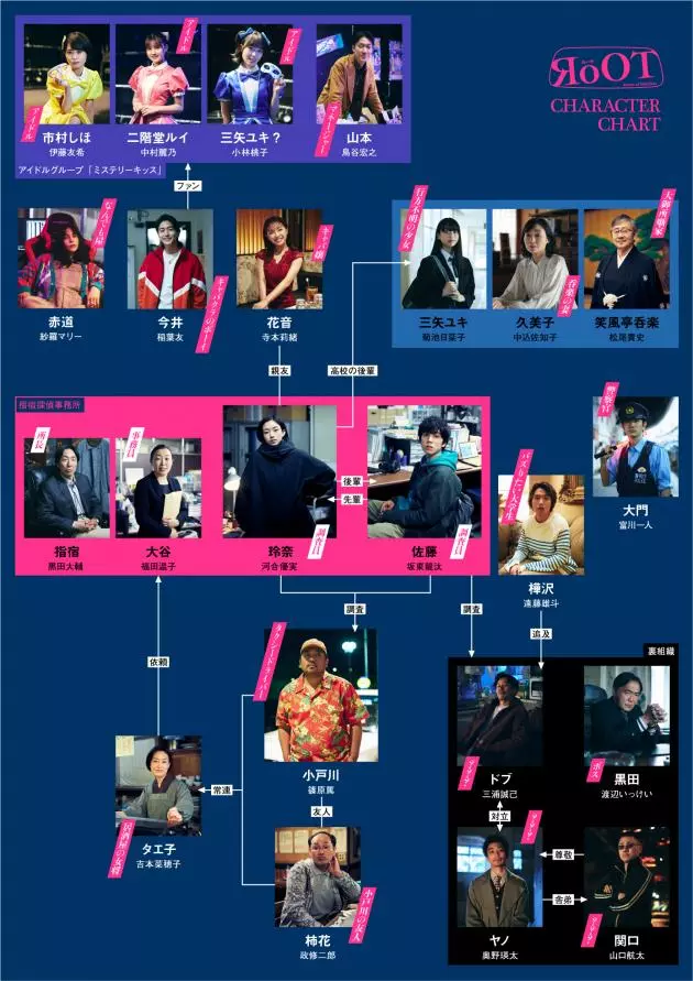 物語の中心となる主人公の玲奈(河合優実)と佐藤(坂東龍汰)。二人が所属する指宿探偵事務所の所長・指宿(黒田大輔)と事務員・大谷(福田温子)。そして二人が調査をする対象がタクシードライバー・小戸川(篠原篤)。友人の柿花(政修二郎)と常連の居酒屋に足しげく通い、女将のタエ子(吉本菜穂子)とも仲がいい。が、ひょんなことからタエ子と知り合った玲奈と佐藤に小戸川の素行調査を依頼したのはタエ子である。なんてことない素行調査が、“女子高生失踪事件”に繋がっていく本作。行方不明の女子高生“三矢ユキ(菊池日菜子)”は玲奈の高校の後輩であり、同じ高校に通っていた親友の花音(寺本莉緒)とも行動を共にし、同姓同名の“三矢ユキ?(小林桃子)”が所属するアイドルグループ「ミステリーキッス」を調査。果たして二人の三矢の関係性は…?後輩の三矢の父親は大御所噺家・笑風亭呑楽(松尾貴史)。さらに得体の知れない裏組織のボス・黒田(渡辺いっけい)、ドブ(三浦誠己)、ドブと犬猿の仲のヤノ(奥野瑛太)ら、バズりたい大学生・樺沢(遠藤雄斗)、なんでも屋・赤道(紗羅マリー)、二階堂ルイ(中村麗乃)推しのキャバクラのボーイ・今井(稲葉友)やミステリーキッスのマネージャー・山本(島谷宏之)、裏がありそうな警察官・大門(富川一人)の存在も気になるところだ。