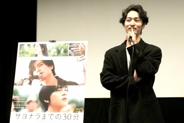 来年1月24日より全国ロードショーとなる映画『サヨナラまでの30分』の涙活試写会が、本日12月18日に東京のアスミック・エース試写室で開催され、劇中バンド「ECHOLL」でドラム担当の重田幸輝を演じた上杉柊平がゲストで登壇した。