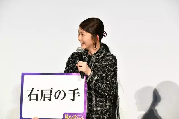 父役の滝藤さんについて、「以前ご一緒していたので、今回再共演できてすごく嬉しかったです。家族のシーンでは無視するシーンが多くて鍛えられました」と話しつつも、「こんなに冷や汗が止まらない舞台挨拶は初めて…」とブザー音に怯える原。続けて、久間田の“右肩の手”にまつわる話では「霊に憑りつかれやすいのですが…(話そうとしていたことが)飛んじゃう…!」と原同様にブザーが鳴らないよう細心の注意を払いながら、「私の肩に青い手が乗っているんです。映画の中では演出が入り、手がとってもリアルに映っていてびっくりしました!」とネタバレすることなく、無事に終えた。