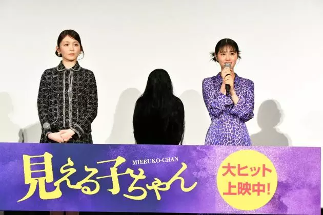 主人公・四谷みこ役を演じた原菜乃華は「映画、楽しんでいただけましたか?」と問いかけると会場からは大きな拍手が巻き起こり、天真爛漫で食いしん坊なみこの親友・百合川ハナ役の久間田琳加は「昨日からハッシュタグで感想を拝見しているのですが、たくさんコメントがあって嬉しいです!」とたくさんの口コミに感謝のコメント。霊能者に憧れる女子高生・二暮堂ユリア役を演じたなえなのは「今日会場に来てる子ちゃんと、ライブビューイングに参加している観てる子ちゃんと、今日は楽しみたいと思います!」と、それぞれ公開を迎え、満面の笑顔で挨拶を行った。