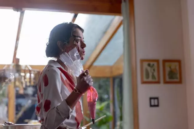解禁された場面写真には、弟ハル(クリスチャン・コンヴェリー)が兄ビルへの憎しみを爆発させ、「ビルが死ぬことを願う」と猿に向かって叫ぶシーンや、猿のおもちゃを巡って巻き起こる数々の“ありえない死”の瞬間が捉えられている。火だるま、生首、眼球からの流血など、まさに“血まみれの98分”を予感させるショットが勢ぞろい。猿を包丁で切断すると中からドロリとした液体が…というグロテスクでコミカルな描写も本作の大きな魅力だ。