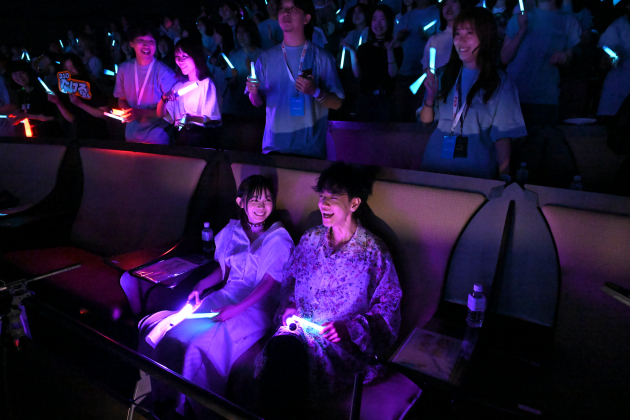 拍手や手拍子、発声はもちろん、スタンディングもOKとあって、1曲目が始まるやいなや観客は一斉に立ち上がり、手拍子を送り、サビを大合唱。本物のライブ会場さながらの熱狂が場内を包み込んだ。照明演出も相まって、身を乗り出す人、中には涙を流す人の姿も見られ、藤谷のMCでは一転して場内が静まり返り、すすり泣く声が響いた。役名を叫び、呼応する声も飛び交い、まるで音楽フェスのような盛り上がりとなった。