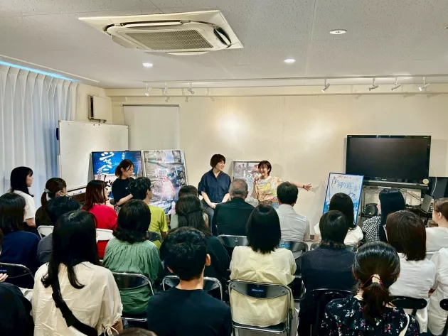 上映が終わると、改めてスクリーンに帰ってきた作品を、それぞれの想いを胸に噛み締める多くの観客で席が埋まっていた。そんな、感動も冷めやらない中、BABEL LABEL所属プロデューサー:前田浩子、劇中絵画制作担当:吉田瑠美の2人が登壇する、上映後イベントが開催された。