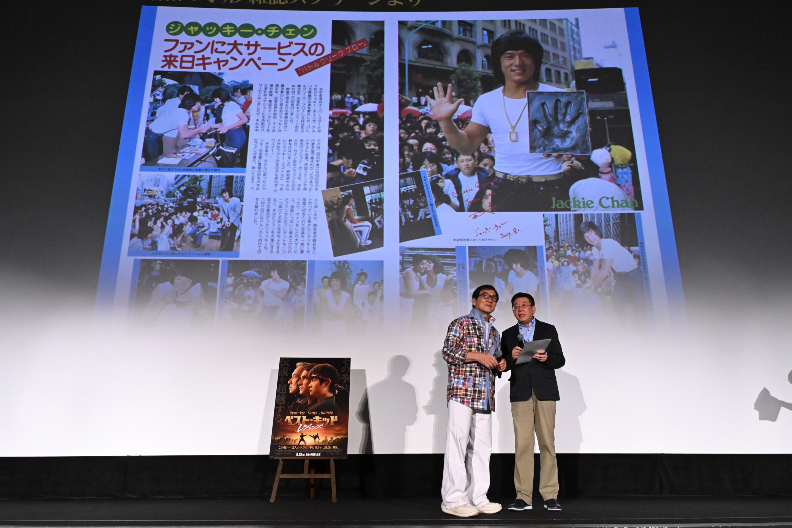 その後は抽選会で当たった観客に直筆サイン入りカードをファンに手渡しする企画も。直接触れ合った観客は「幸せです!」と感極まったコメントを残し、ジャッキーと熱い抱擁と握手を交わした。最後にジャッキーは「日本に来て映画館で皆さんに会えるのが一番嬉しい。長年のサポートに心から感謝します。映画を作る力は皆さんが与えてくれるもの。世界中のファンにありがとうを伝えたいです」と語り、「ぜひ映画館で映画を観てください!映画産業を応援してください!“(日本語で)僕、頑張ります!”」と力強く呼びかけた。笑顔で観客へ手を振りながら退場するジャッキーに、観客は最後まで拍手を送り続け、熱狂の中で舞台挨拶は幕を閉じた。