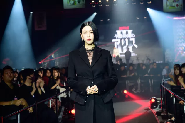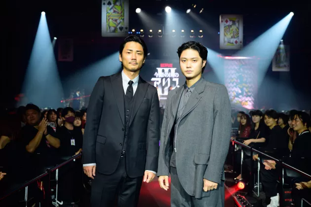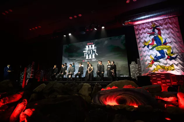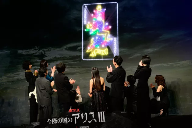 映像・照明・レーザー・LEDによる没入感あふれる演出の中、シーズン3の鍵となるトランプの「JOKER」がそびえ、まるで「今際の国」に入り込んだかのような感覚を味わえる会場には大勢の来場者が集まる大盛況に!漆黒のブラックカーペットを歩いて姿を現したキャスト・監督らの姿に場内には大きな歓声が沸き起こり、熱気と高揚感が高まる中、豪華イベントが開幕。