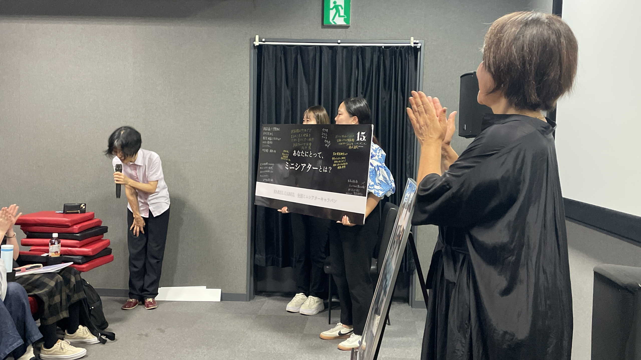最後に観客とのQ&Aを経て、「あなたにとってミニシアターとは?」という問いをテーマにした“旅するパネル”との記念撮影が行われた。このパネルには、全国の劇場支配人たちが寄せ書きのように思いを綴っている。今回は、鹿児島市の天文館エリアで消えかかっていた映画館の灯火を、「ガーデンズシネマ」をはじめることで絶やさず継続させた支配人の黒岩美智子さんは「未来をひらく扉、人とつながる癒しの場」という、この映画館に込めた想いを記した。続いてキャラバン開催にあたっては「ミニシアターは色々と大変な中ですが、このように皆さんに応援いただいて頑張っていけます。お客様に支えられて、ガーデンズシネマも15年目になりました。BABEL LABELさんも15年目スタートということで一緒に頑張っていけたらと思います」と、力強く語った。