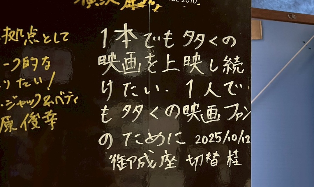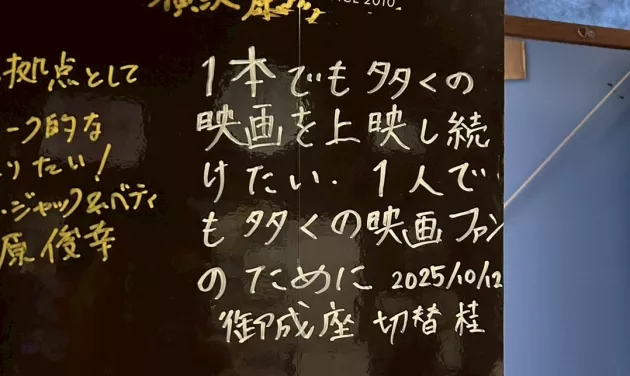 最後に、このキャラバンを通して実施されている「旅するパネル」との記念撮影へ。このパネルには、「あなたにとって、ミニシアターとは?」という質問に対して、これまでキャラバンを巡ってきた各地のミニシアター支配人の方々から、寄せ書きのように答えていただいているもので、今回は、2019年に「御成座」を復活させて、多くの人々に映画との出会いを提供し続けている、運営会社の代表取締役の切替桂さんから「一本でも多くの映画を上映し続けたい。一人でも多くの映画ファンのために」という、この映画館の存在意義と、優しくも力強いメッセージが伝えられると、その気持ちに賛同する観客から大きな拍手が送られた。