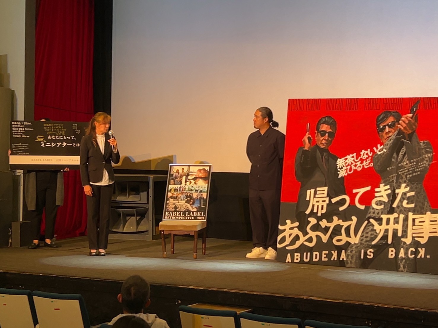 BABEL LABELとも繋がりが深く、特に、今回のキャラバンでも上映される、藤井道人監督作品『デイアンドナイト』は、隣接する鹿角市や、秋田県でロケを行った作品ということに留まらず、「御成座」の絵看板を手掛ける仲谷政信氏が美術ボランティアとして映画に参加していたり、それ以降、絆は今も続き、今回のミニシアターキャラバンが「御成座」で開催される理由の一つにもなっている。そんな「御成座」で、10月11日(土)より“BABEL LABEL全国ミニシアターキャラバン”がスタート。劇場の正面には上映する3作品のポスターや、『デイアンドナイト』『ヤクザと家族 The Family』の手書き絵看板。そして、今回のために描かれて、完成したばかりの『帰ってきた あぶない刑事』の絵看板が輝きを放っていた。館内にも今回上映される3作品の他に、今回、イベントに登壇する原廣利監督の『朽ちないサクラ』のポスター、藤井道人監督の『宇宙でいちばんあかるい屋根』、『青春18×2 君へと続く道』の絵看板が掲出され、御成座がBABEL LABERL一色に染まっていた。そんな、特別な賑わいを見せる劇場で、10月12日(日)BABEL LABEL所属監督:原廣利が登壇する『帰ってきた あぶない刑事』の上映後舞台挨拶がスタートした。