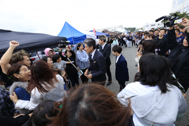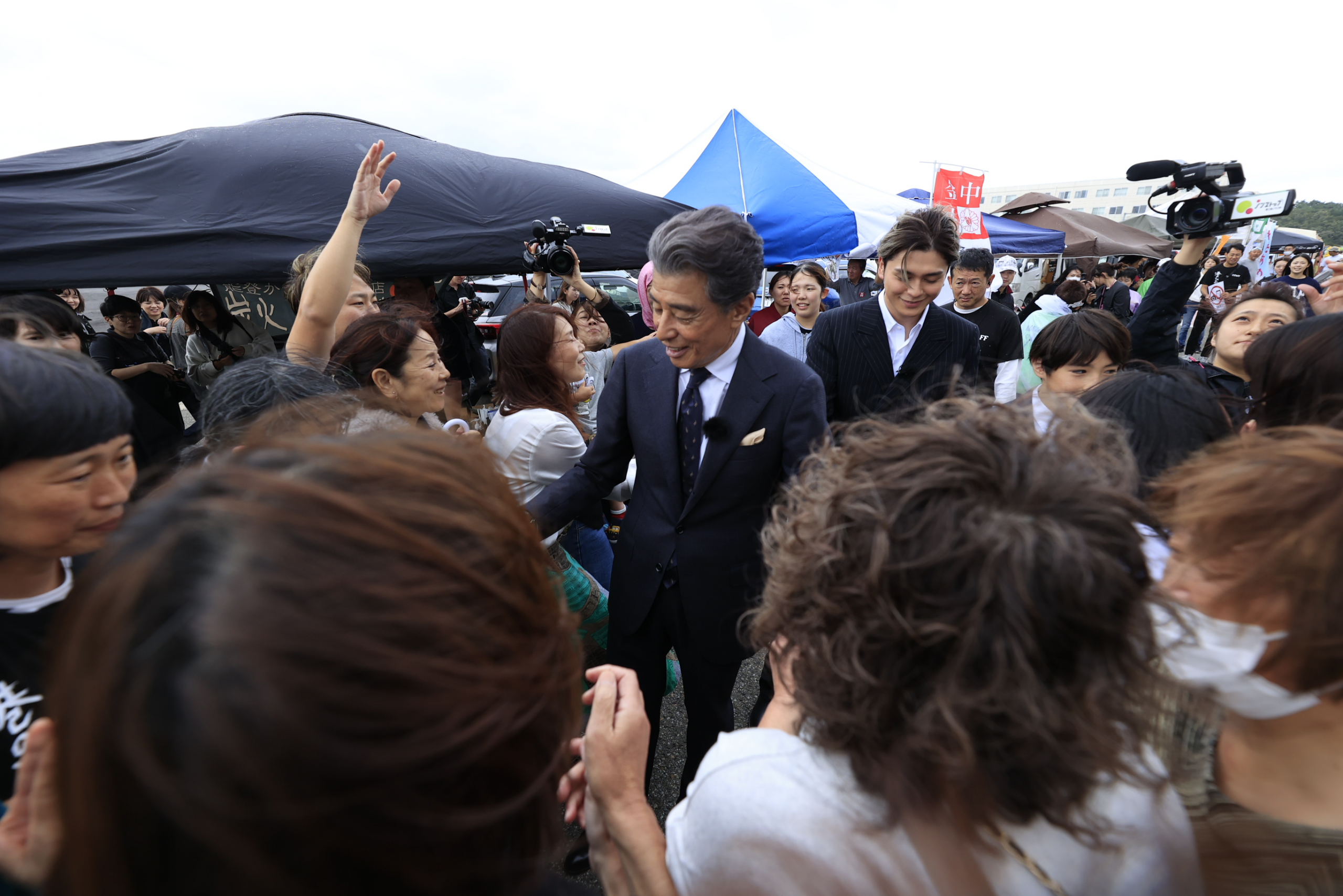 会場には輪島朝市物産展やキッチンカーなど約100軒の店舗が並び、地元グルメを楽しむ来場者で賑わいを見せた。祭りのような熱気に包まれるなか、航空学校の校舎から舘が姿を現すと、観客席から大きなどよめきと歓声が沸き起こった。眞栄田と尾上も続けて登場し、会場は一気に熱気に包まれる。