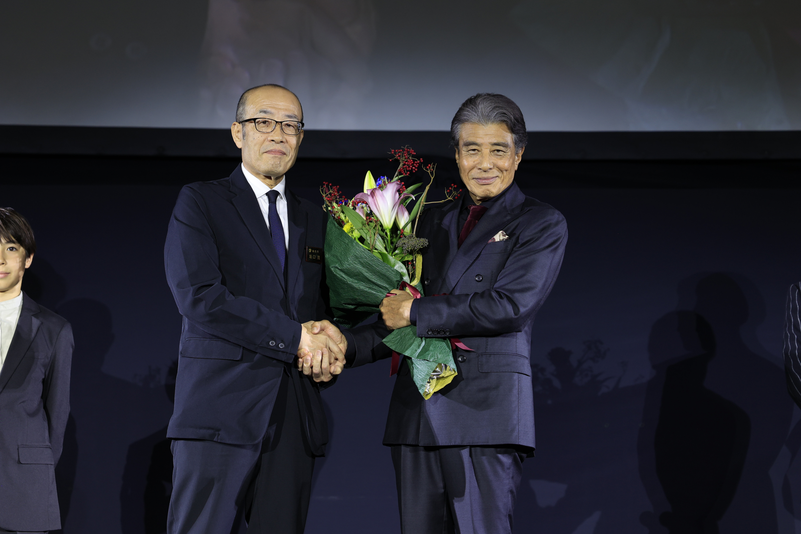 さらにイベントの終盤では、輪島市長・坂口茂から花束の贈呈が行われた。代表して舘が花束を受け取ると、坂口市長は「この映画の中では震災前の美しい北陸の情景がたくさん収められていると聞いております。昨今では珍しい35mmのフィルムカメラで収められていると聞いているので楽しみです」と映画への期待を寄せながら、「昨年の能登半島地震、そして豪雨によって撮影された場所も大きく被災し、甚大な被害を受けております」と今の被災地の現状を説明する。「メインの舞台となった大沢漁港も地震と豪雨で被災が大きく、大沢町もまだまだ復旧復興の途中ではありますが、この映画が大沢地区をはじめ輪島市、そして能登地域の復旧復興の大きな光となることを願っています」と思いを明かすと、会場からは温かい拍手で包まれた。