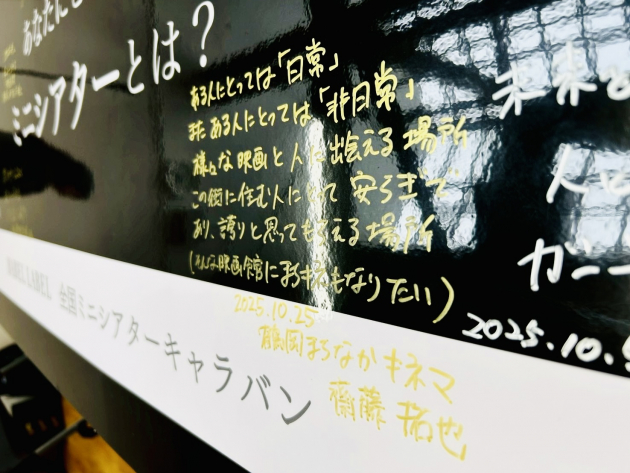 最後に、このキャラバンを通して実施されている「旅するパネル」との記念撮影へ。このパネルには、「あなたにとって、ミニシアターとは?」という質問に対して、これまでキャラバンを巡ってきた各地のミニシアター支配人の方々から、寄せ書きのように答えていただいているもので、今回は、閉館前からこの劇場に携わり、再開に向けても尽力してきた、支配人の齋藤拓也さんから「ある人にとっては“日常”またある人にとっては“非日常”様々な映画と人に出会える場所、この街に住む人にとって安らぎであり、誇りと思ってもらえる場所(そんな映画館にまちキネもなりたい)」と、一度、閉館に追い込まれながらも再開させた意義と熱い想いについて、とても重みのある言葉をいただいた。そのまま記念撮影が終わり、本日、ひとつ目の舞台挨拶は盛況の中幕を閉じた。