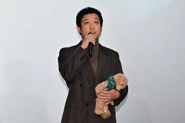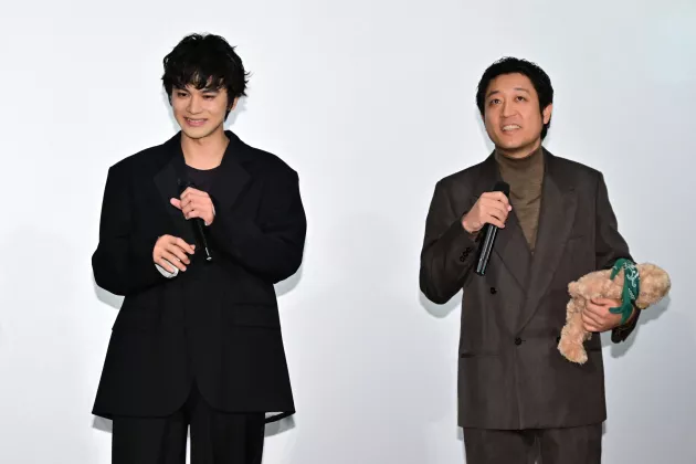 ジョージの部下・佐藤役の嶺は劇中でキーとなるテディベアを持参し「撮影時に比べて痩せたし、髪の⽑も伸びちゃって。撮影時はめっちゃご飯を食べて日サロに通って関西弁を仕込んでもらって。楽しかったです」と柔和な表情で回想した。