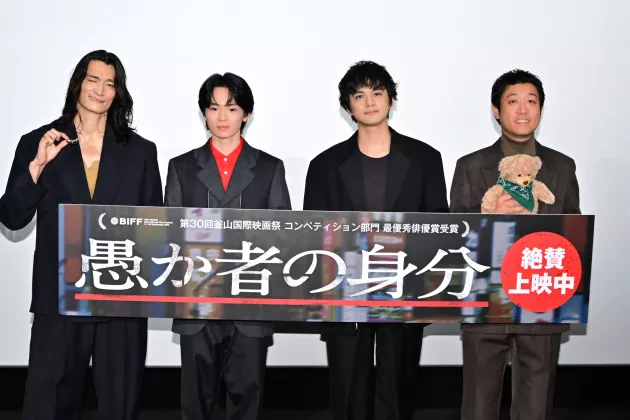 ⼈間ドラマを巧みに描くことに定評のある永⽥琴監督が、主演に北村匠海、共演に綾野剛、林裕太の豪華実⼒派キャストを迎え、愛を知らずに育った3 ⼈の若者たちの⻘春と、闇ビジネスから抜け出す3 ⽇間を描く逃亡サスペンス映画『愚か者の身分』の公開御礼舞台挨拶が11⽉7⽇に都内劇場にて実施され、出演者の北村匠海、林裕太、⽥邊和也、嶺豪⼀が参加した。