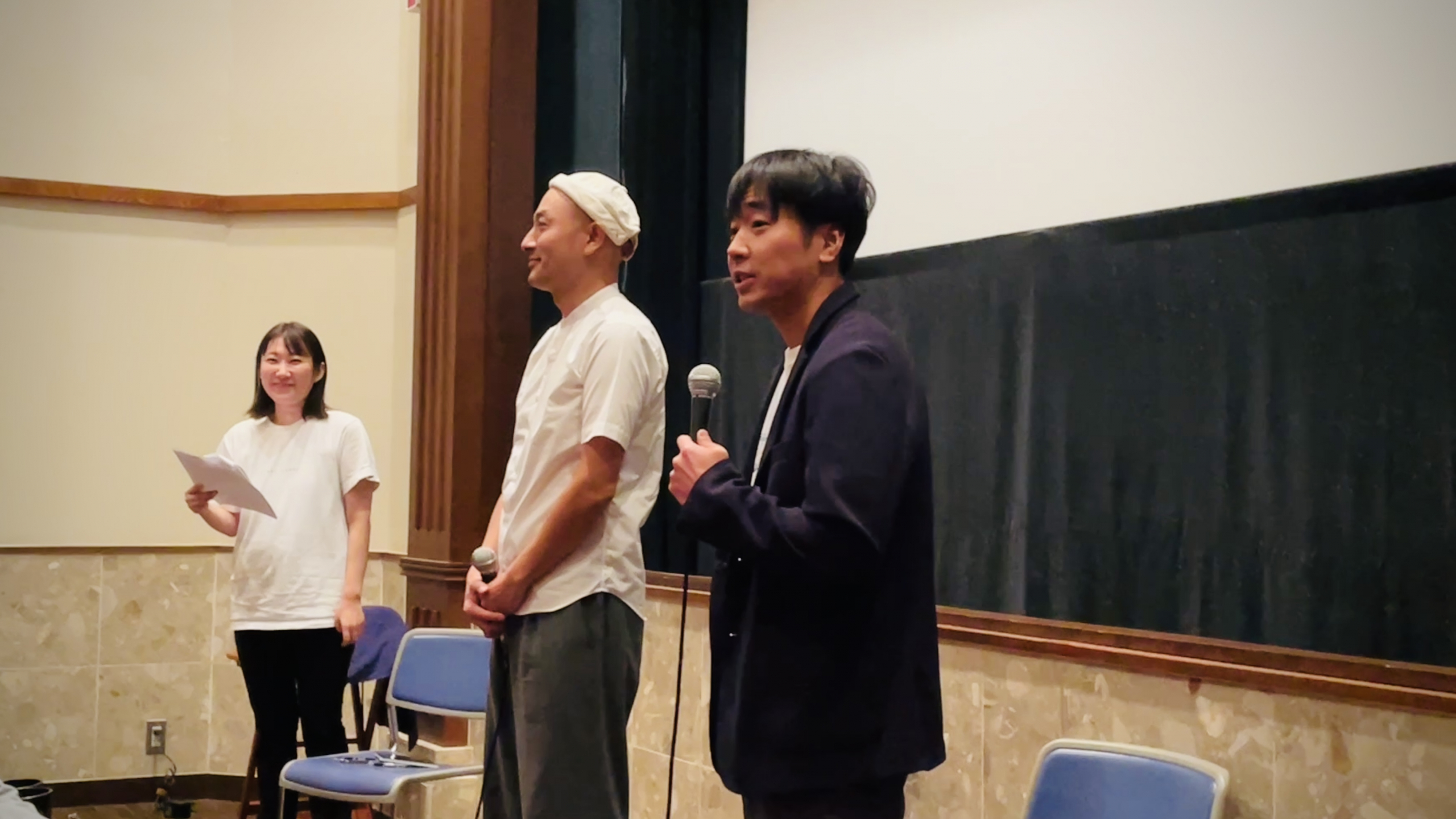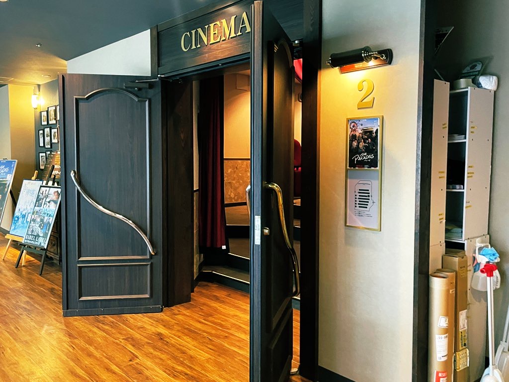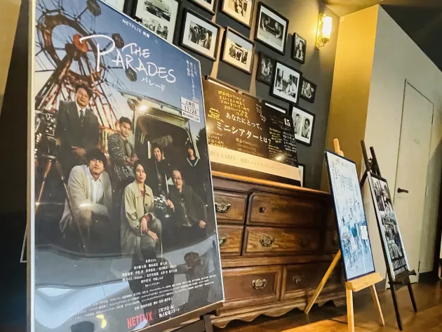 そんな、「シネマパレット」で、11/21(金)から、“BABEL LABEL全国ミニシアターキャラバン”がスタート、劇場の外からは場内への繋がる重厚感のある木造の扉が二つ見え、その間に劇場スタッフの方々によって飾られた、15周年キャラバンのパネルや作品パネルが出迎えてくれた。そんな、賑わいを見せる劇場で、BABEL LABEL道上巧矢プロデューサー、 スターサンズ行実良プロデューサーが登壇するNetflix 映画『パレード』の上映後舞台挨拶がスタートした。