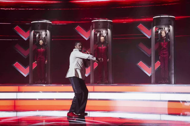 L-r, Katy O’Brian, Colman Domingo, Glen Powell and Martin Herlihy star in Paramount Pictures’ “THE RUNNING MAN.”