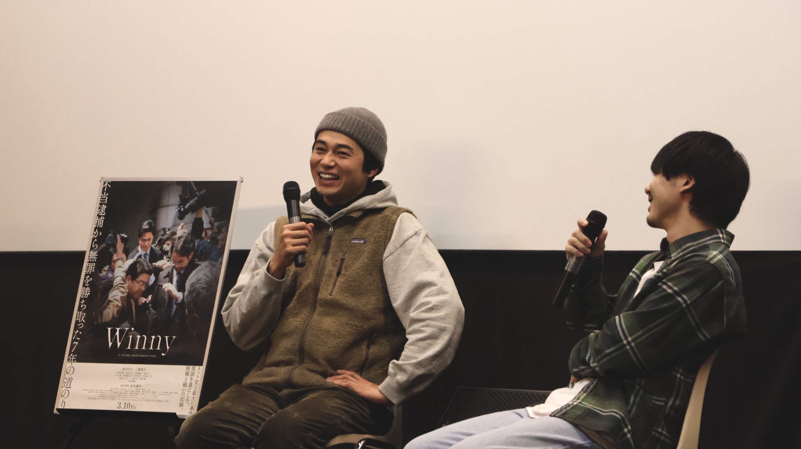 上映が始まる前に降り続いていた雨をかき消すかのように、上映終了の瞬間には大きな拍手が場内に響き渡った。そこに登壇者である東出昌大、松本優作監督が登場すると、さらに大きな拍手に包まれた。松本監督は、自身の作品がユーロスペースで上映されるのは意外にも今回が初めてであり、『Winny』の久しぶりの上映となったこの日を迎えられたこと、そして観客への感謝を語った。東出は松本監督との久しぶりの再会を「同窓会のような気持ち」と表現し、松本監督も「東出との出会いは運命。変わっていなくてうれしかった」と語り、同じ志を持って作品を作り上げた仲間との再会を喜ぶ様子に、観客から温かな眼差しが送られた。2人はミニシアターについて「目指す場所」「観客と対話が出来る場所」「作り手としてレベルアップ出来る場所」「魂がある場所」と、それぞれの思い入れを語り、ミニシアターでの新たな出会いに感謝してイベントは幕を閉じた。
