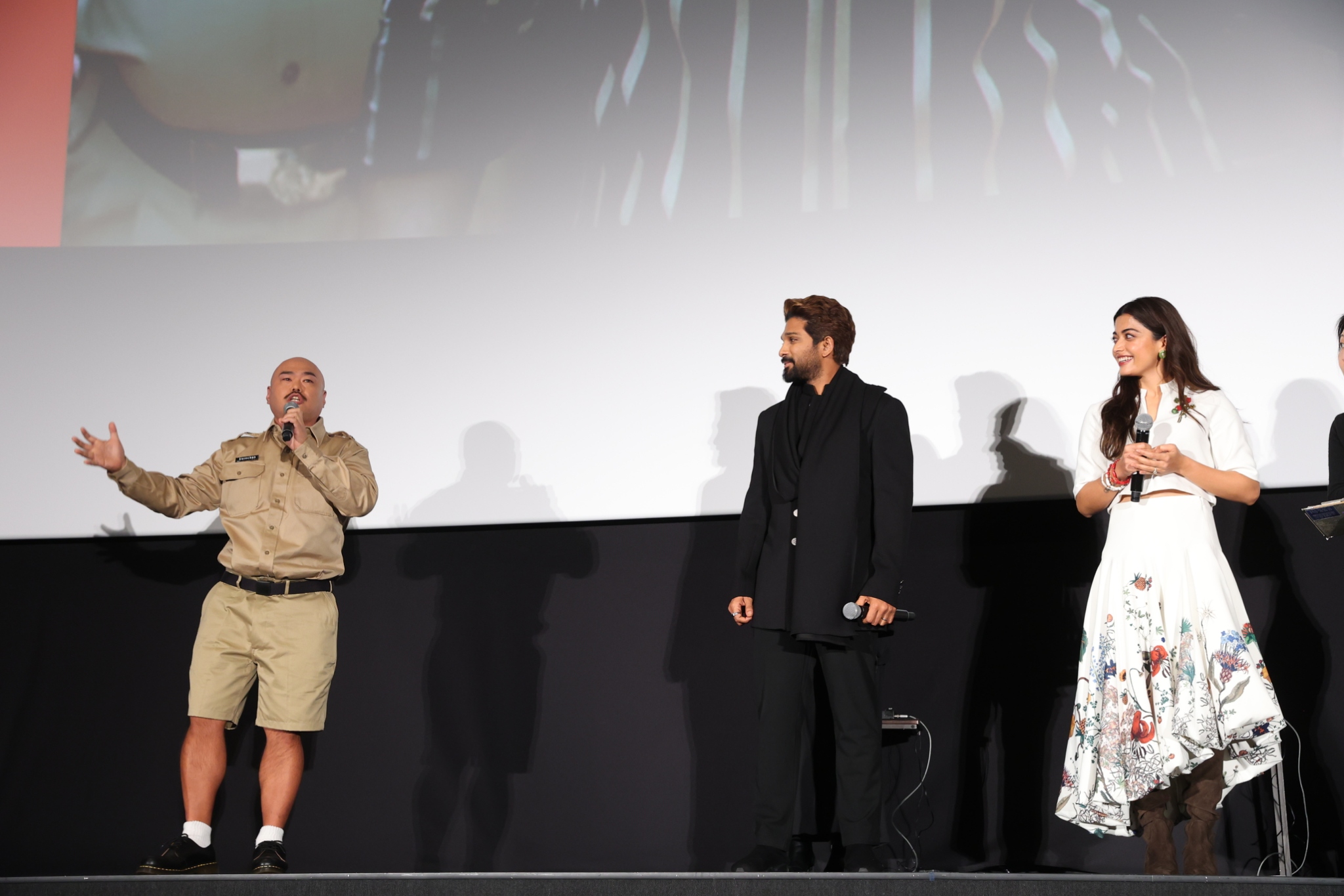 最後にアルジュンが「映画の冒頭、プシュパの最初のセリフを日本語で言わせてください」と呼びかけると、「こんにちは。日本の友よ、 元気 か 、 俺の ブツ が届く国をずっと 見 たかった んだ。やっと来 れ た 。日本は寒い、寒い」と劇中のセリフを日本語で披露し、会場は興奮のるつぼで大盛り上がりとなった。