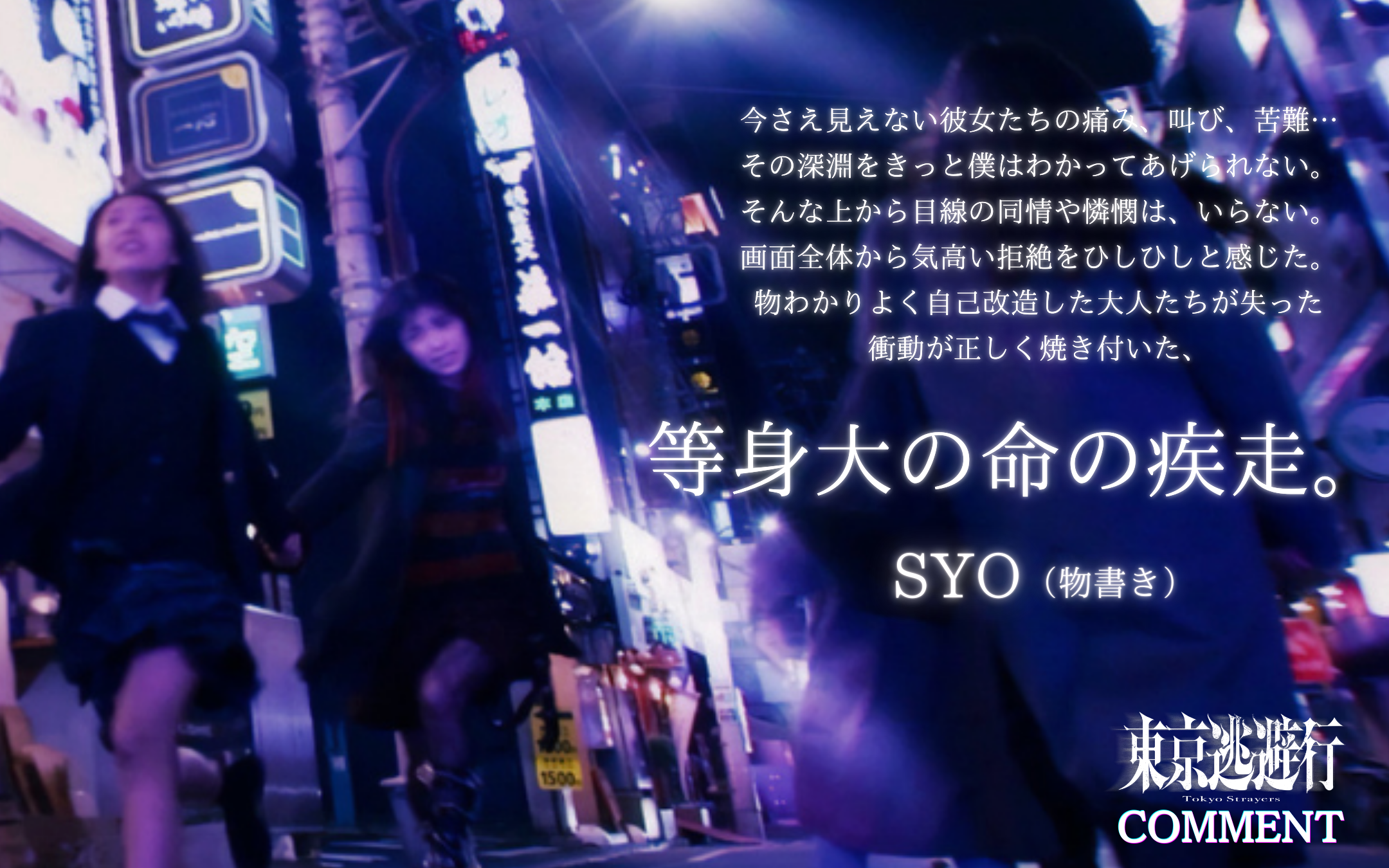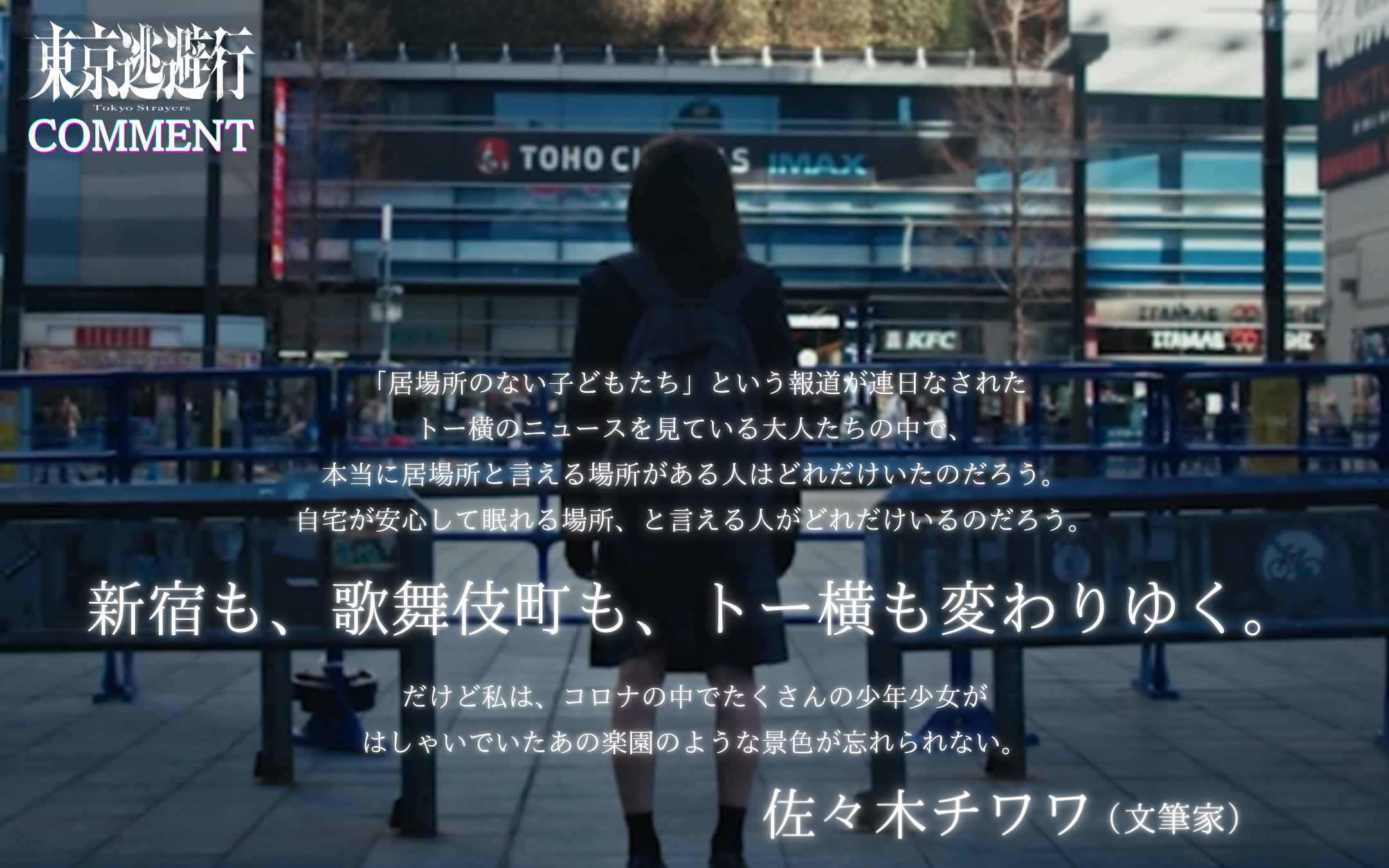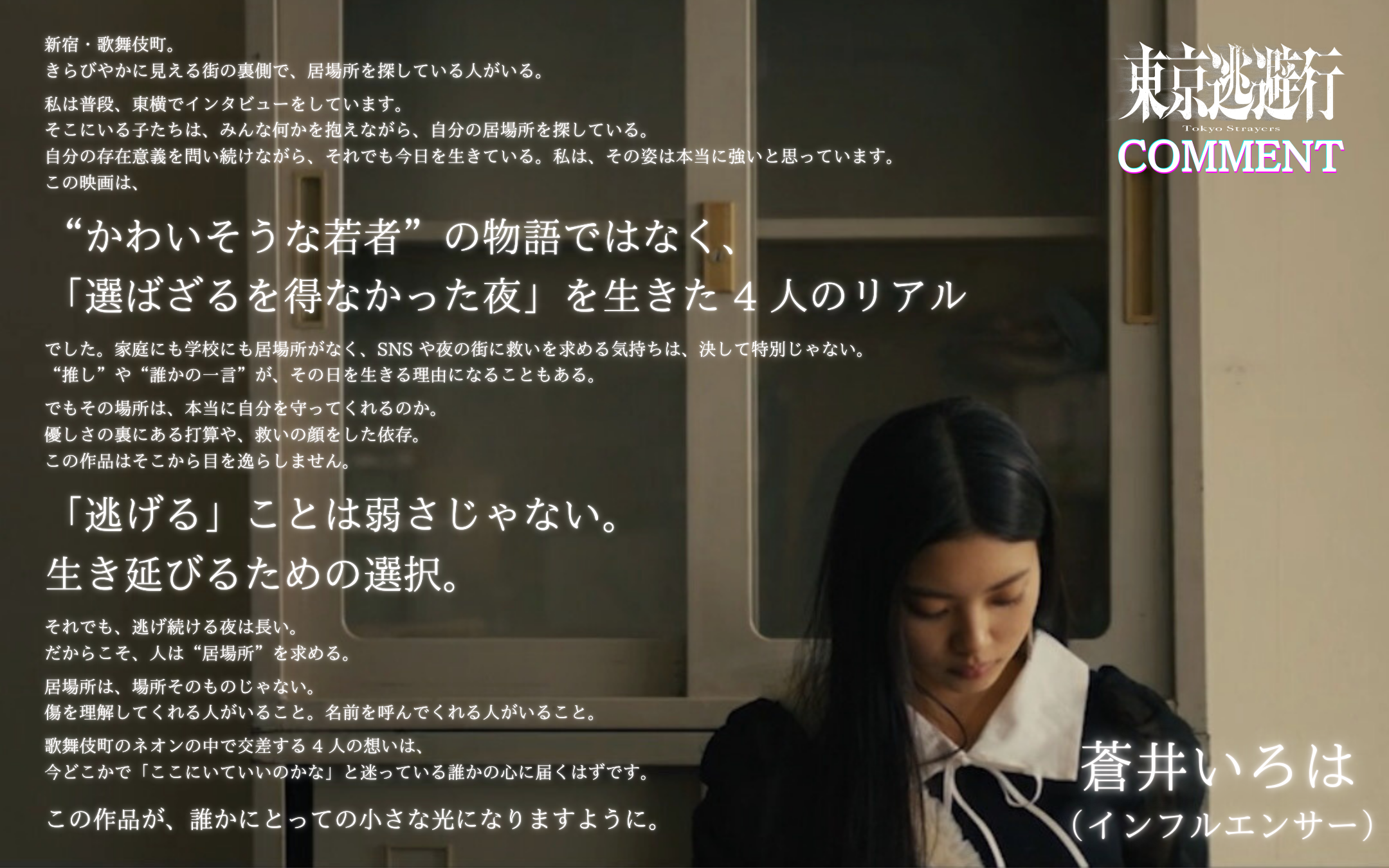 また、著名人コメントも到着。俳優・プロデューサーのMEGUMIは「居てもいいし、逃げてもいい。自分を守るという選択は、決して弱さではない。その真実を、まっすぐに突きつけてくる作品でした」とコメント。作家の鈴木涼美は、歌舞伎町の持つ危うさと煌めきに触れながら、「どんなに警告されてもその時必要な煌めきがそこにあった」と本作に共感を寄せた。さらに、『愚か者の身分』を手がけた永田琴監督は「どうか、この叫びに気づく大人が増えてほしい」と言葉を寄せ、漫画家の古屋兎丸は「将来有望な若い監督が見つめている“現在”は、きっと僕が見ているものと同じだ」と秋葉監督に期待を寄せている。そのほか、川口葵、莉子、蒼井いろは、佐々木チワワ、研そうげん、SYO、しんのすけ、東紗友美ら、映画、文学、カルチャーの各分野からも支持の声が集まった。