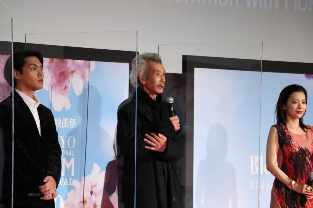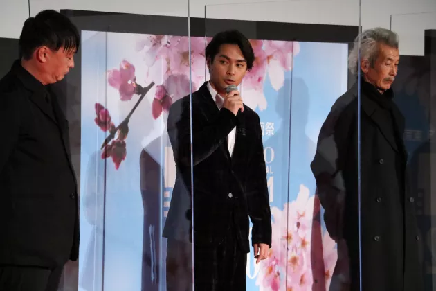 その後小池知事のメッセージが代読され、続いてはクロージング作品の紹介がされた。今回クロージング作品に選ばれたのは世界的に有名な浮世絵師、葛飾北斎の生涯を描いた『HOKUSAI』。監督の橋本一、葛飾北斎の青年期と老年期を演じた柳楽優弥、田中泯、そして脚本・企画の河原れんが登壇した。