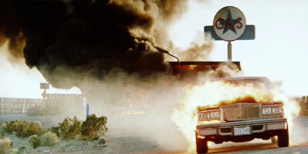 炎にまみれ走行するクルマ、爆発するガソリンスタンド、そして、”逃げても 逃げても 奴はやってくる“の文字と共にフロントガラスを突き破ってまでジムを執拗に追い「やあ 坊や」と挨拶をしてくる恐ろしい殺人ヒッチハイカーの姿が。恐ろしく謎に満ちた存在でありながら、どこか人を惹きつける魅力に溢れているのも見どころだ。