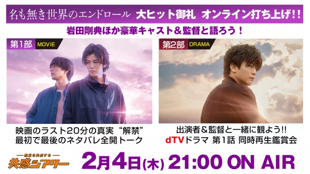 現在、絶賛公開中の映画『名も無き世界のエンドロール』 、そしてdTVで配信中の、映画の“その後”を描いたオリジナルドラマ『Re:名も無き世界のエンドロール 〜Half a year later〜』。この2作品の大ヒットを記念すると共に、これまで長きにわたって「名も無き」を応援してくれたファンに感謝を込め、主演の岩田剛典、佐藤祐市監督らキャスト&スタッフがリモート形式で一堂に介し、完全無料の視聴者参加型オンラインイベントを、インターネット生放送局「共感シアター」にて実施することが決定!