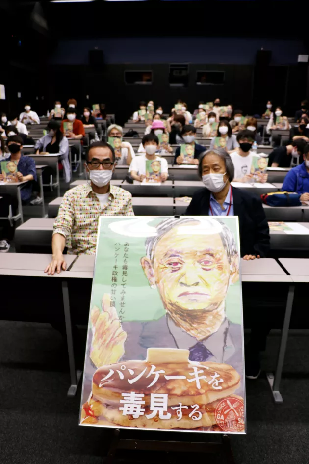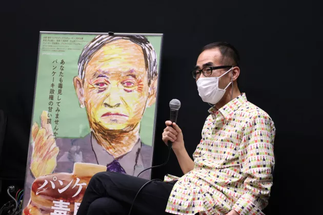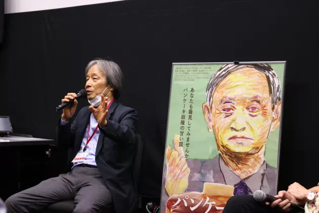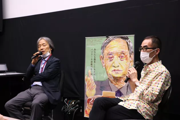 河村「まずエンターテインメントととして面白くしたいと思いました。日本のドキュメンタリーは対象を追って、その人から話を聞くというのが主流ですが、この人(菅首相)にその手法は無理です(笑)この映画はただこき下ろすのではなくて、褒めても構わない。現実の姿を見せようと。自民党からも石破元幹事長が出てくれてますけど、幅広くキチっと捉えていく。しかしやっぱり”うーん”と考えさせらるような作品にしたかった。それと秋の総選挙も意識しています。ぜひ投票を入れて欲しいと。」