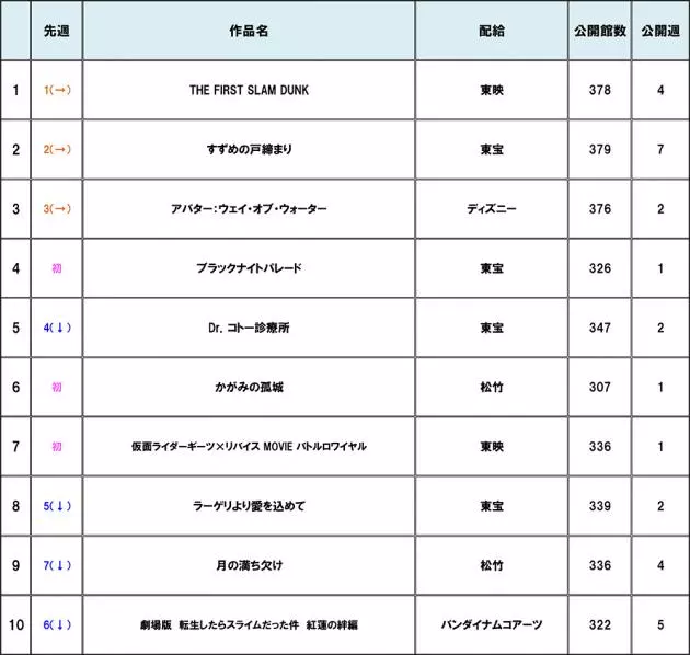【#興行収入ランキング 】『THE FIRST SLAM DUNK』『すずめの戸締まり』『アバター:ウェイ・オブ・ウォーター』は動かず!トップ1・2・3位をキープ!新作は『ブラックナイトパレード』『かがみの孤城』『仮面ライダーギーツ×リバイス MOVIE バトルロワイヤル』が新たにランクイン!