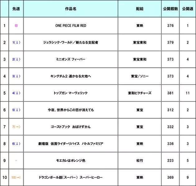 【#興行収入ランキング 】『ONE PIECE FILM RED』が1位にランクイン!今年最高の週末成績、動員158万人&興収22億5400万円を突破!