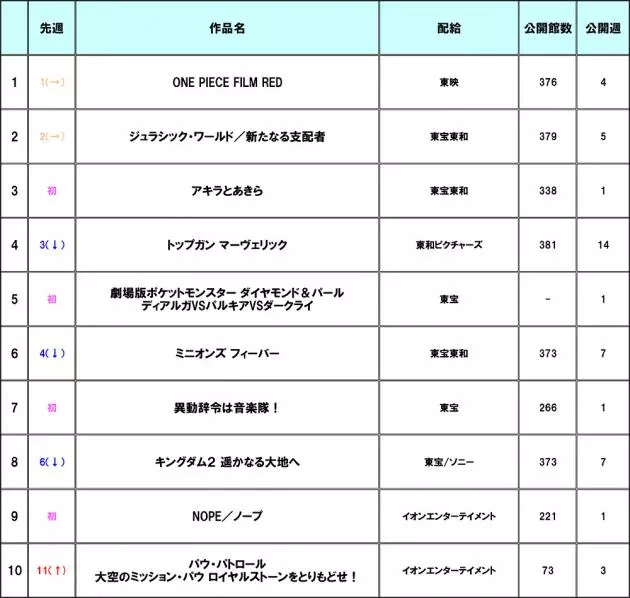 【#興行収入ランキング 】『#ワンピース』と『#ジュラシック・ワールド』が1・2位をキープ!新作は『#アキラとあきら』『#NOPE/#ノープ』など4作品がランクイン!