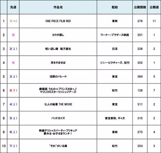 【#興行収入ランキング 】『#ワンピース』が11週連続トップをキープ!新作は #橋本環奈 主演のホラー映画『#カラダ探し』、不朽の名作を実写化した『#耳をすませば』がランクイン!