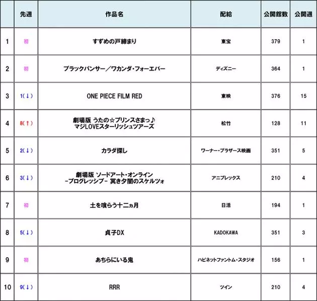 【#興行収入ランキング 】新海誠最新作『すずめの戸締り』が1位スタート!『ブラックパンサー/ワカンダ・フォーエバー』は2位発進!その他新作は『土を喰らう十二ヵ月』が7位、『あちらにいる鬼』が9位にランクイン!