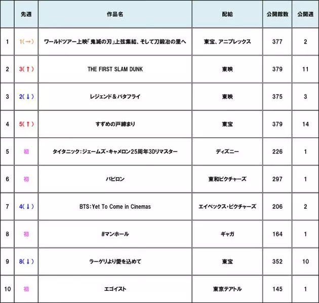【#興行収入ランキング 】ワールドツアー上映『鬼滅の刃』が1位でキープ!初登場作品は『タイタニック:ジェームズ・キャメロン25周年3Dリマスター』『バビロン』『#マンホール』『エゴイスト』と4作品がランクイン