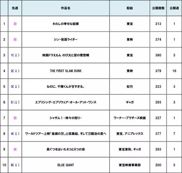 【#興行収入ランキング 】#目黒蓮(#SnowMan)主演『#わたしの幸せな結婚』が1位スタート!期待の #庵野秀明 監督作『#シン・仮面ライダー』は2位発進!その他新作は『#シャザム!〜神々の怒り〜』『#長ぐつをはいたネコと9つの命』がランクイン!