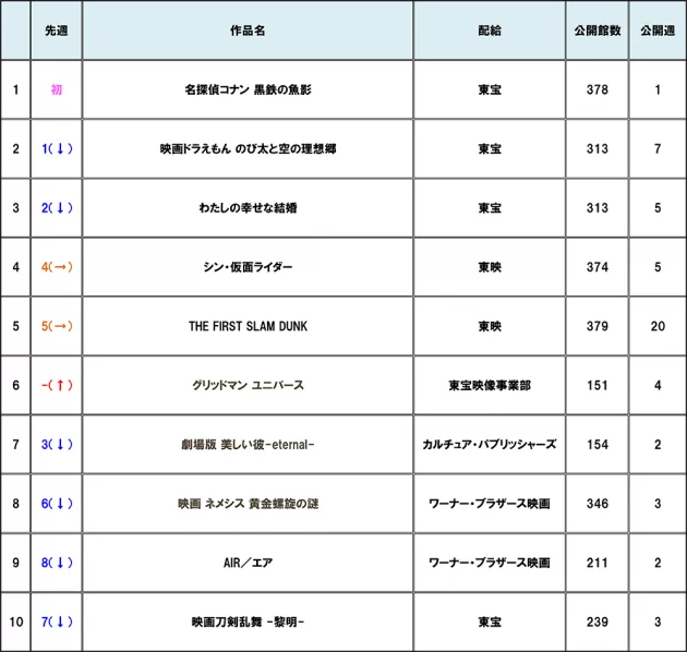【#興行収入ランキング 】シリーズ最新作『名探偵コナン 黒鉄の魚影』が初登場1位で登場!4位『シン・仮面ライダー』5位『スラムダンク』はランキングを維持!アニメ『グリッドマン ユニバース』が圏外から6位に浮上!