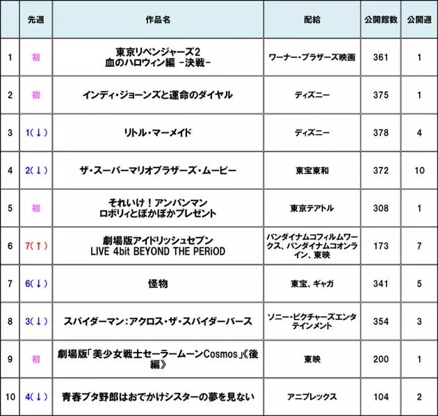 【#興行収入ランキング 】『東京リベンジャーズ2 血のハロウィン編 -決戦-』が初週1位でスタート!『インディ・ジョーンズと運命のダイヤル』は2位に。その他新作は『それいけ!アンパンマン ロボリィとぽかぽかプレゼント』『劇場版「美少女戦士セーラームーンCosmos」《後編》』がランクイン!