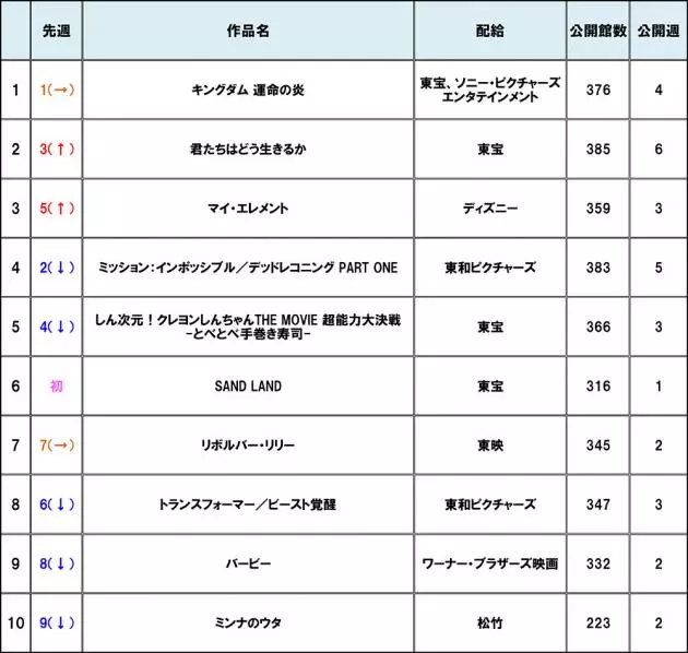 【#興行収入ランキング 】『キングダム 運命の炎』が4週目も首位をキープ!新作は鳥山明の漫画をアニメ化した『サンドランド』がランクイン!