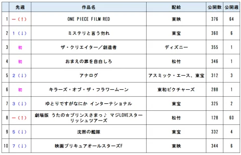 【#興行収入ランキング 】約1年ぶりに『ONE PIECE FILM RED』が首位獲得!『ザ・クリエイター/創造者』は3位スタート!『おまえの罪を自白しろ』は4位にランクイン