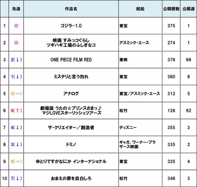 【#興行収入ランキング 】『ゴジラ-1.0』が初登場1位!公開3日間で興行収入10億円を突破!その他新作は『映画 すみっコぐらし ツギハギ工場のふしぎなコ』が2位にランクイン!