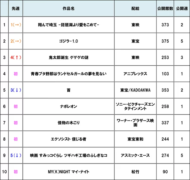 【#興行収入ランキング 】『翔んで埼玉 -琵琶湖より愛をこめて-』と『ゴジラ-1.0』がトップ2をキープ!『鬼太郎誕生 ゲゲゲの謎』が先週から1ランクアップ!新作は『ナポレオン』『エクソシスト』ほか5作品がランクイン!
