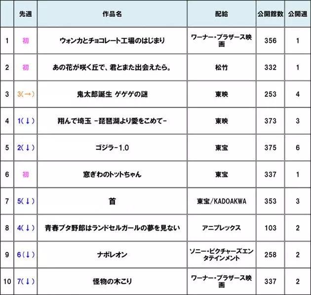 【#興行収入ランキング 】『ウォンカとチョコレート工場のはじまり』と『あの花が咲く丘で、君とまた出会えたら。』が1・2位でランクイン!その他の新作ではアニメ『窓際のトットちゃん』が8位にランクイン!