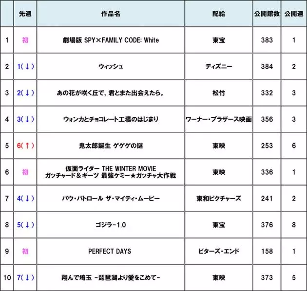 【#興行収入ランキング 】『劇場版 SPY×FAMILY CODE: White』が『ウィッシュ』を抑え初登場1位でスタート!その他新作は『仮面ライダー THE WINTER MOVIE 』『PERFECT DAYS』がランクイン!