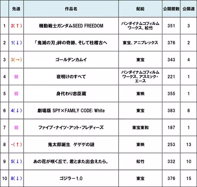 【#興行収入ランキング 】1位は『機動戦士ガンダムSEED FREEDOM』が再びランクアップ。その他新作は『夜明けのすべて』『身代わり忠臣蔵』『ファイブ・ナイツ・アット・フレディーズ』がランクイン!