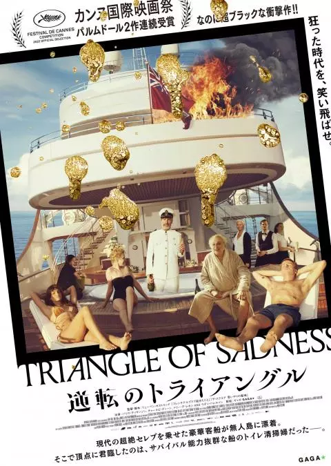 オストルンドによれば、原題の「トライアングル・オブ・サッドネス(悲しみの三角形)」とは美容業界の用語で眉間のしわを指すという。悲しんだり、不快な表情になると刻まれるものだ。そのしわは、たった15分のボトックス注射によってできにくくなる。しかし劇中の、現実社会のしわ寄せに対して何度も顔をしかめるには、15分は十分すぎる時間だ。クルーズ船のみならず、宇宙船地球号の行き先は? そして、スクエア(四角)、トライアングルと来たオストルンドの次回作は? 角が取れて丸くなるか? いや、それはないだろう。本作がこれだけ意地悪なのだから。これがセレブの集まるカンヌで最高賞に輝くのも最高に皮肉が効いている。もしかしたら、セレブたちも自分たちの裕福さに罪悪感を感じているのかもしれない。…10年近くずっと。