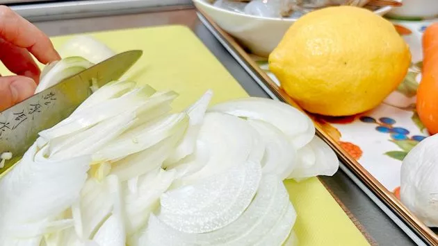 セロリ、人参、玉ねぎ、にんにくを薄切りにします。